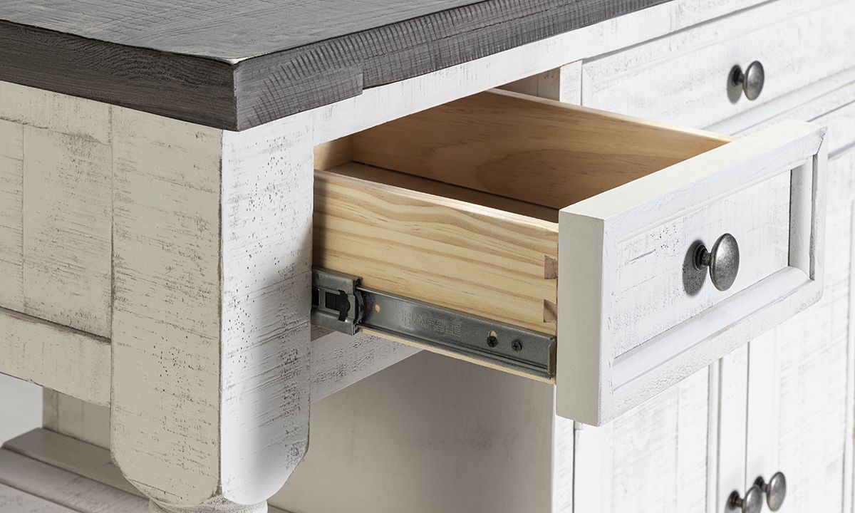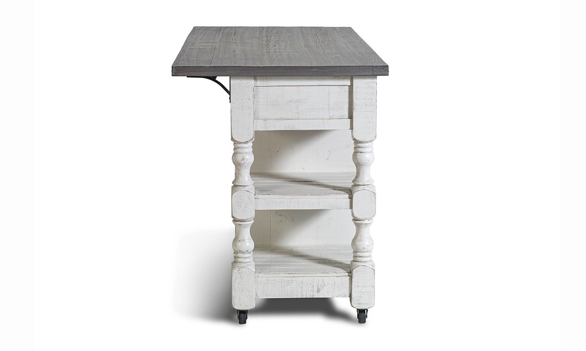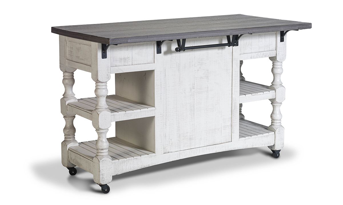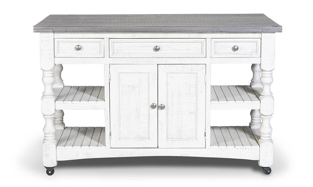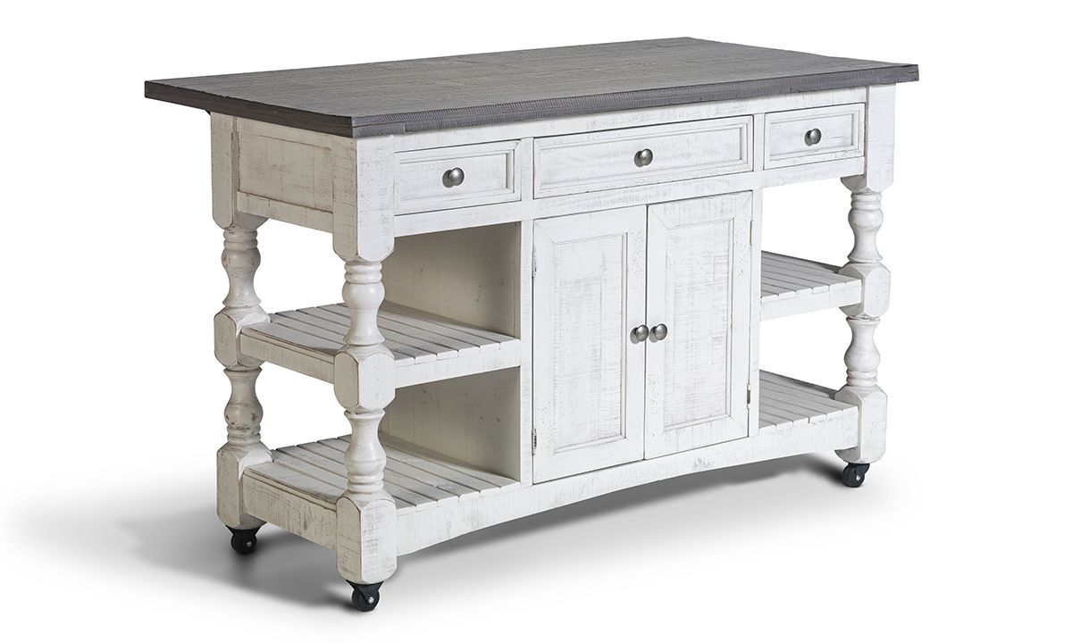 Equipped to maximize your kitchen’s storage and prep space while adding timeless charm, the Sage White Large Kitchen Island is a perfect pairing or form, fun and function. Thoughtfully crafted from solid Pine, this multi-functional island includes a spacious storage cabinet with interior shelf, three convenient storage drawers, a towel rack, four open shelves and rolling casters for easy mobility. Inspired by timeless farmhouse designs, the ivory and grey two-tone finish are hand-rubbed for a lived-in look while the turned wood legs on each end turn up the traditional charm. Pull up a stool or two to the extended surface space on the backside to turn the island into a casual dining or entertaining space perfectly suited to small space living.