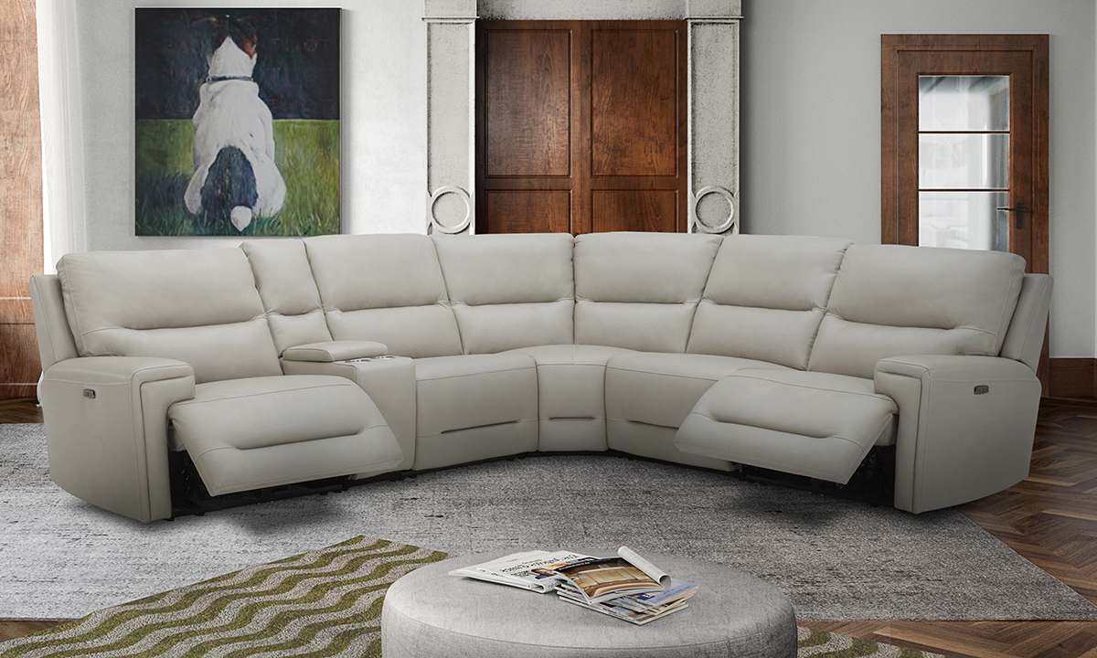 Six-piece sectional pairs luxurious cream-colored leather upholstery with the comfort of three power recliners with power headrests.