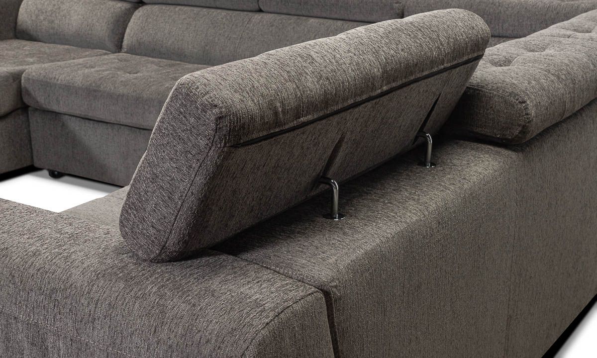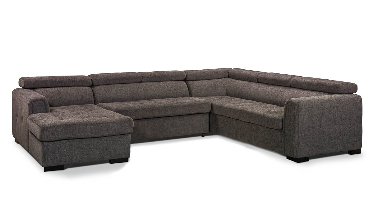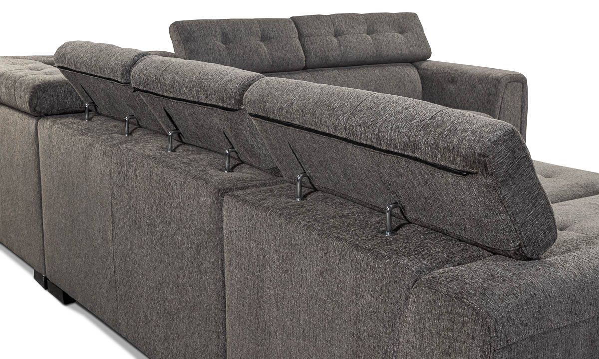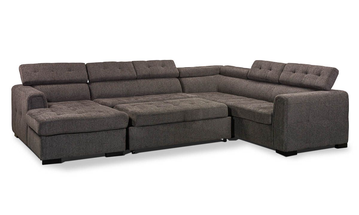 The Tilden Smoke Sleeper Sectional combines contemporary style and convenience in one versatile design. Its dark grey high-performance upholstery offers a relaxed look, with tufted cushions for fuss-free lounging. Adjustable headrests and a 65-inch chaise lend extra comfort to this sectional, with hidden storage in the corner to keep all your entertainment essentials neatly tucked away. Transition this living room staple from day to night by pulling out the center loveseat, creating approximately 127” x 65” of space to stretch out and sleep. Keep additional blankets and pillows that guests will need close at hand in the storage space concealed beneath the chaise cushion.